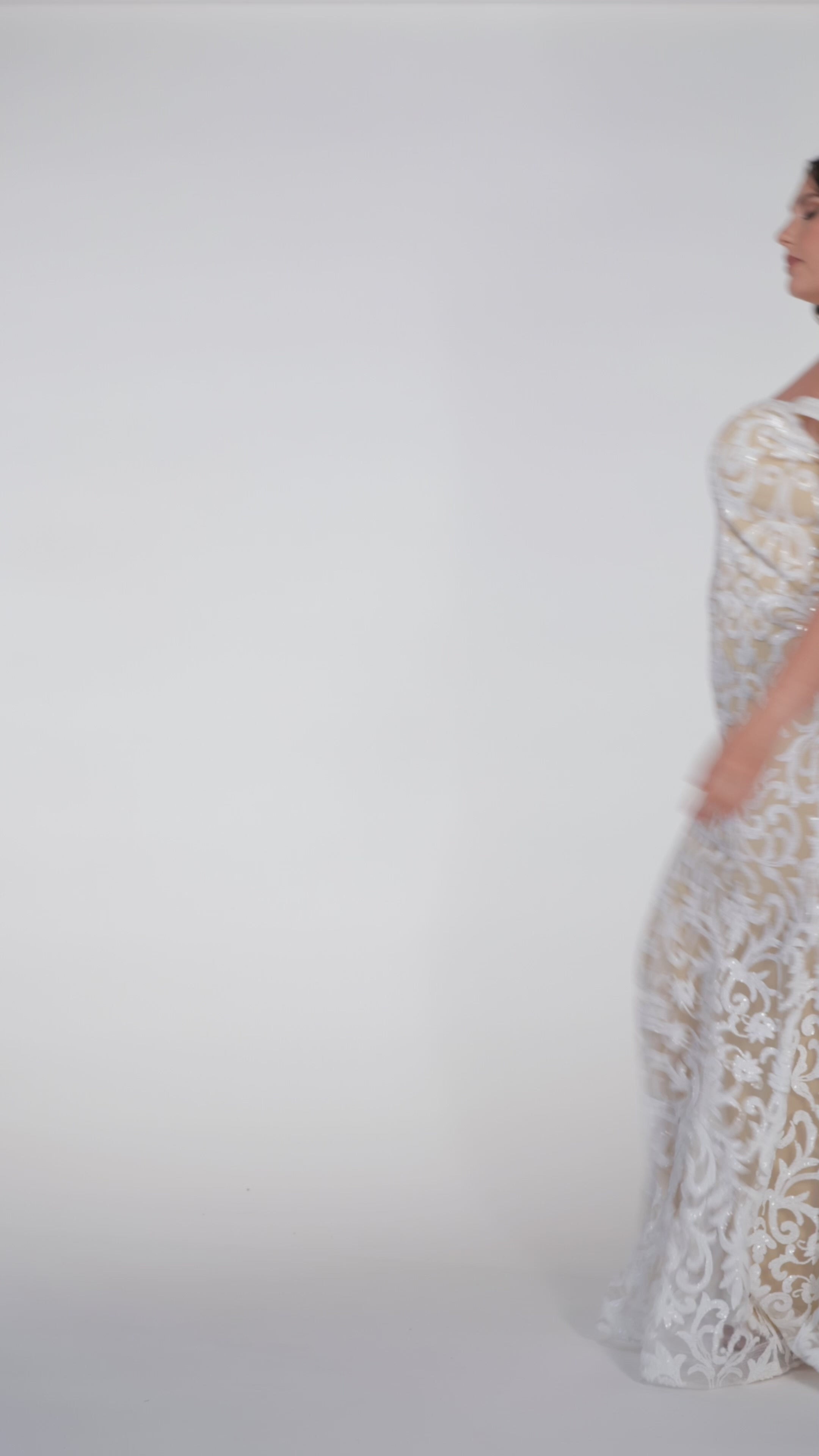 Plus-size woman wearing an off-the-shoulder nude and ivory sequin embroidered formal gown with sweetheart neckline, off-the-shoulder straps and fitted silhouette. CE2611 available from Sydney's Closet