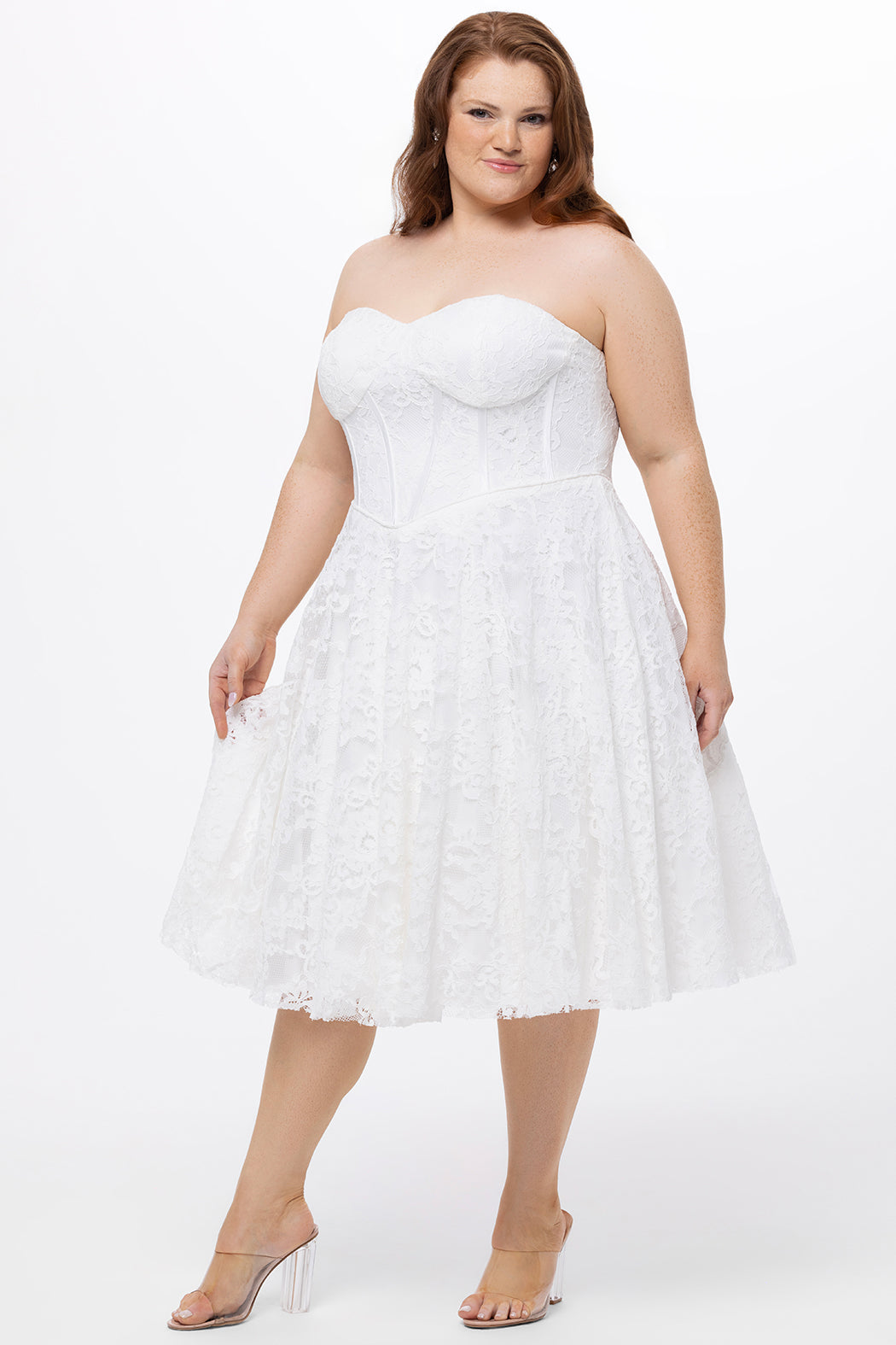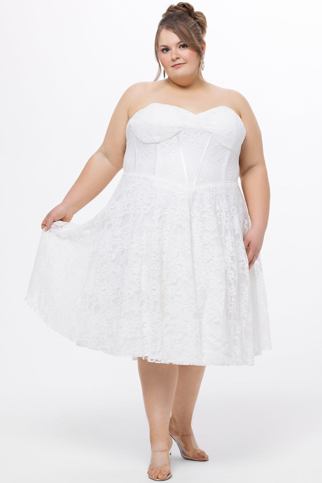 A: Not at all! While it makes a gorgeous - and romantic - option for a bridal wardrobe, Style CE2613 looks chic as a plus-size white lace cocktail dress that is perfect for garden parties, rooftop soirées, cruises, or any event where you want to look effortlessly chic.