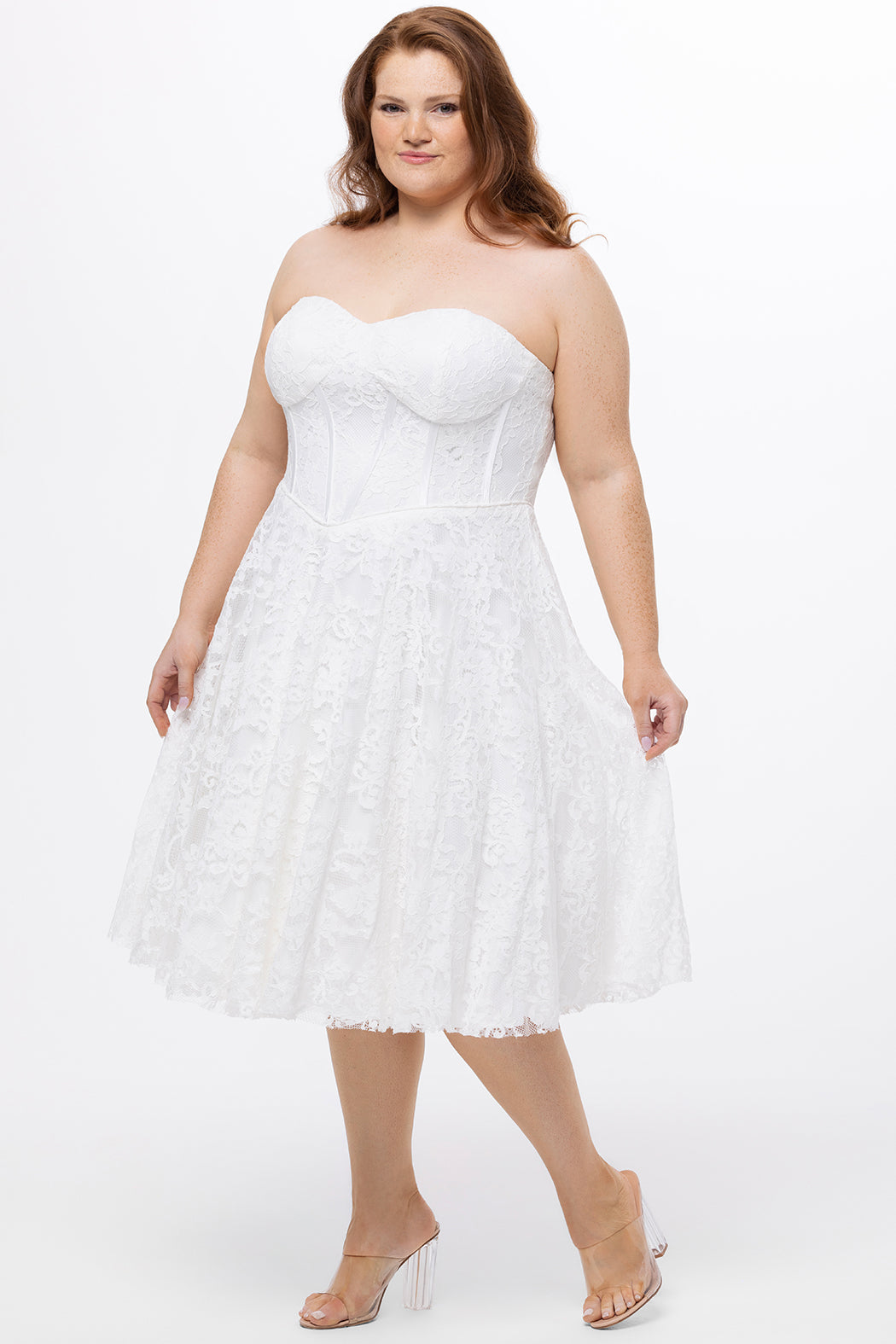 Q: Does this white lace tea-length dress flatter curvy figures?