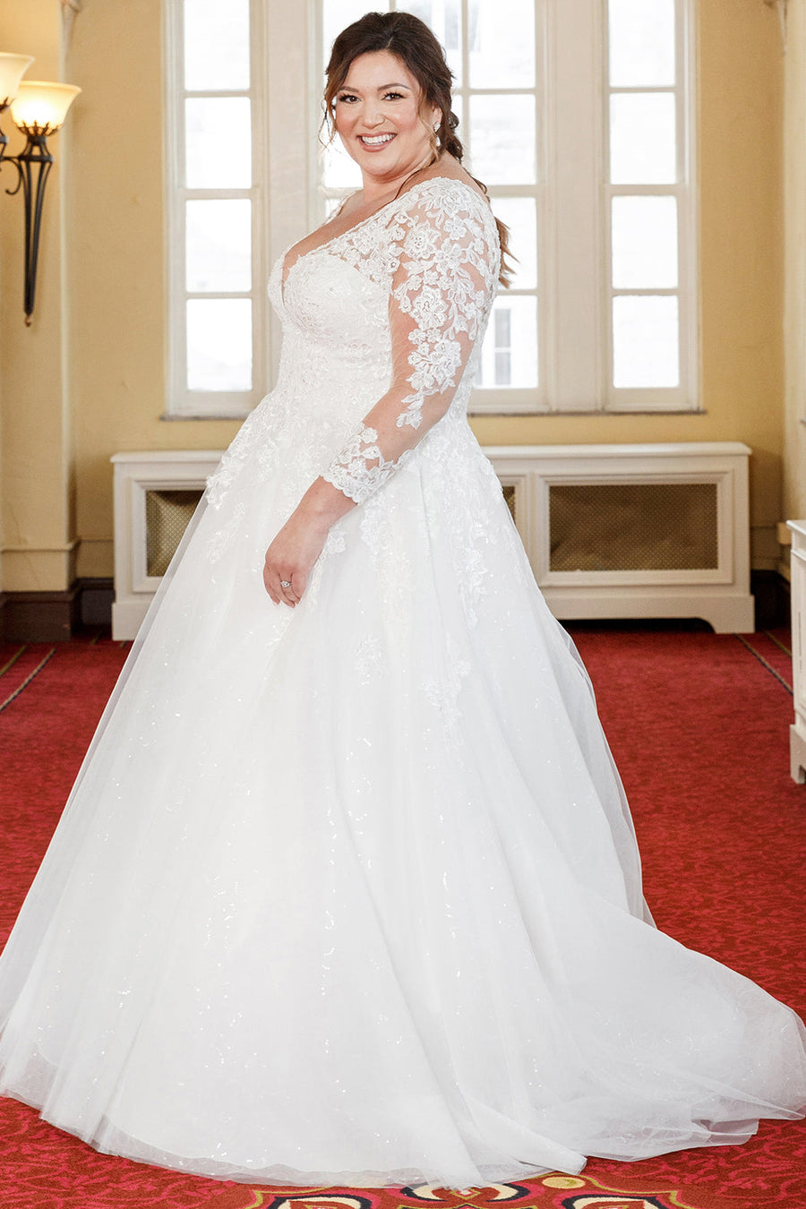 Look enchanting on your wedding day in our Valentina lace floral wedding dress. Sequin lace floral appliques adorn the flattering V-neck and long sleeves. An underlayer of sparkling tulle adds a romantic, almost fairytale look, to the A-line skirt and long train. Your choice of Ivory with Ivory mesh or Ivory with Nude mesh for an updated look on a classic design. Michelle Bridal style MB2321 available in plus sizes 14-32.