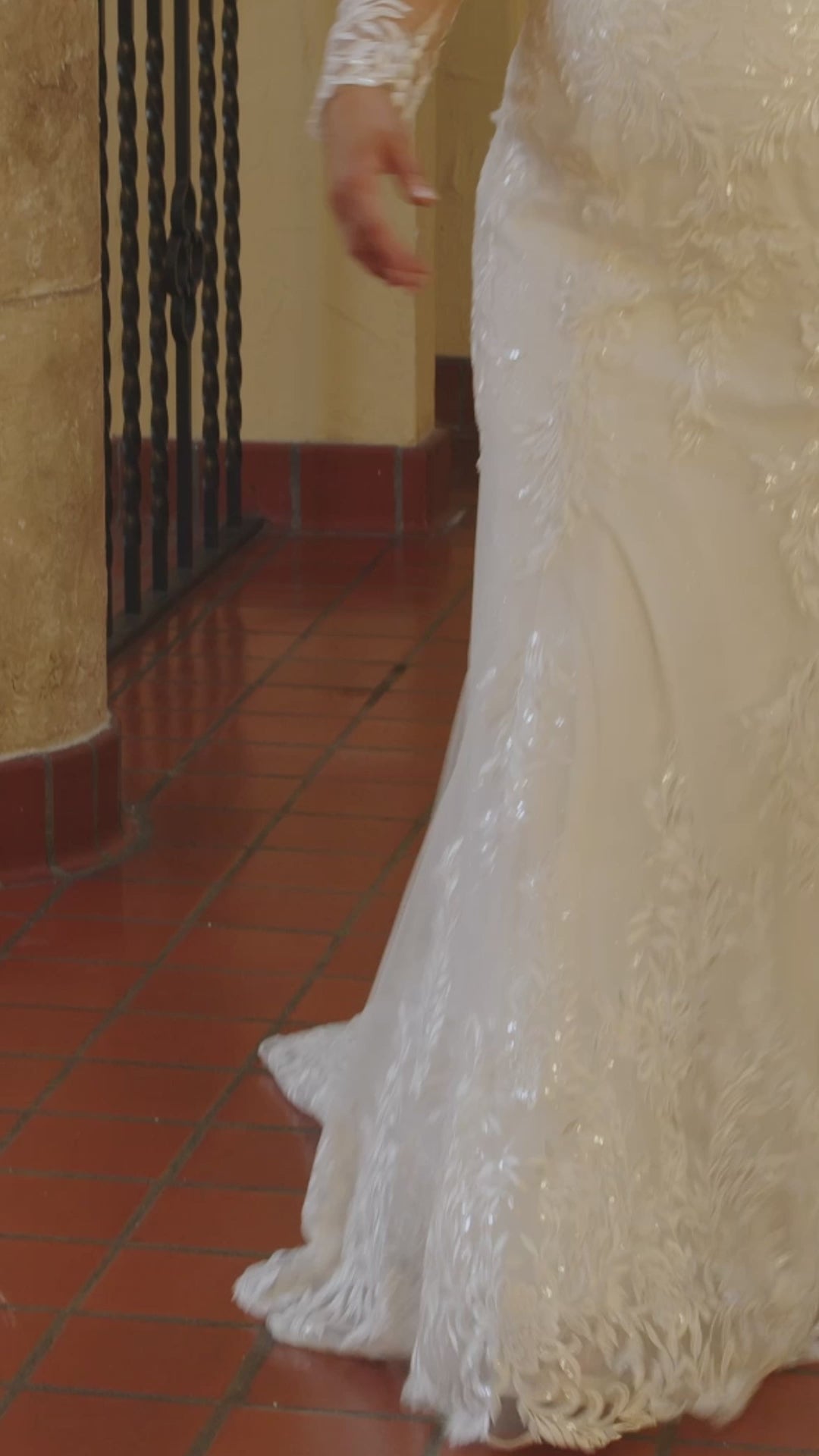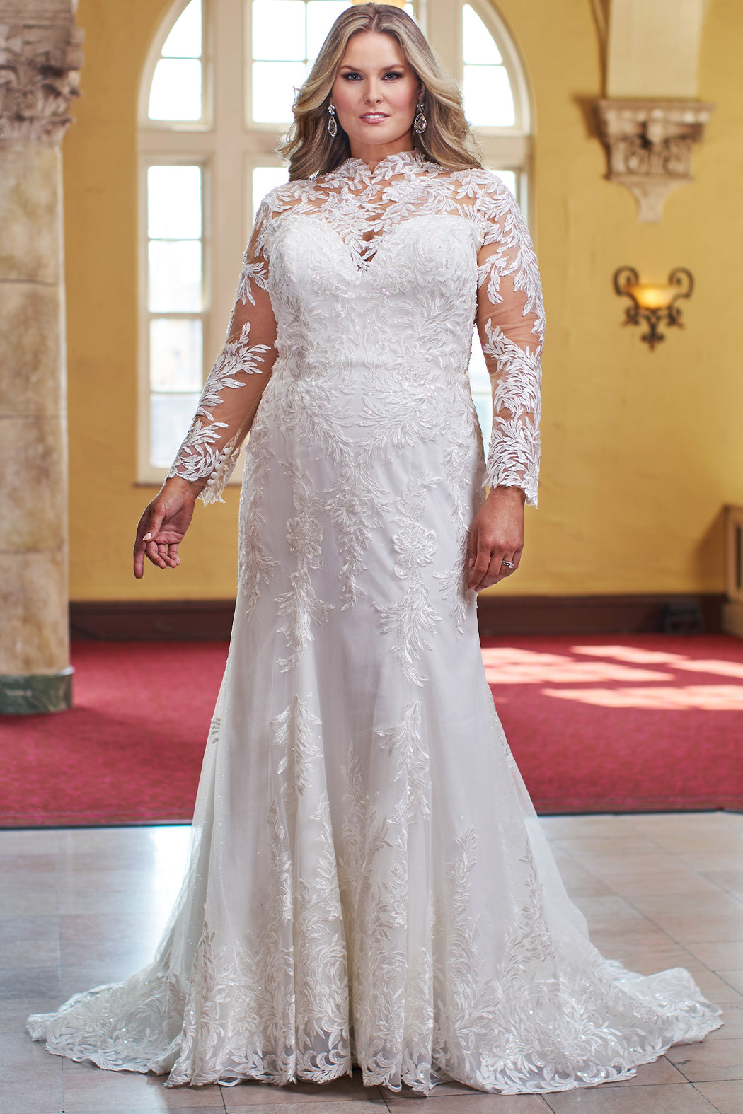 Look effortlessly elegant on your special day when you wear the romantic Piper plus size Lace wedding dress. The Trumpet silhouette slims your curves in all the right places. Exquisite embroidered lace appliques sparkle with clear sequins, bugle beads and cut glass. when splashed over bodice, skirt and long illusion net sleeves. The high neckline adds a chic design detail that's all the rage right now with contemporary brides looking for a charming touch. For added glamour, the keyhole cutout on the back will have all eyes on your when you go down the aisle. Michelle Bridal Style MB2423 designed to fit fashion-savvy brides who wear plus sizes 14-32.