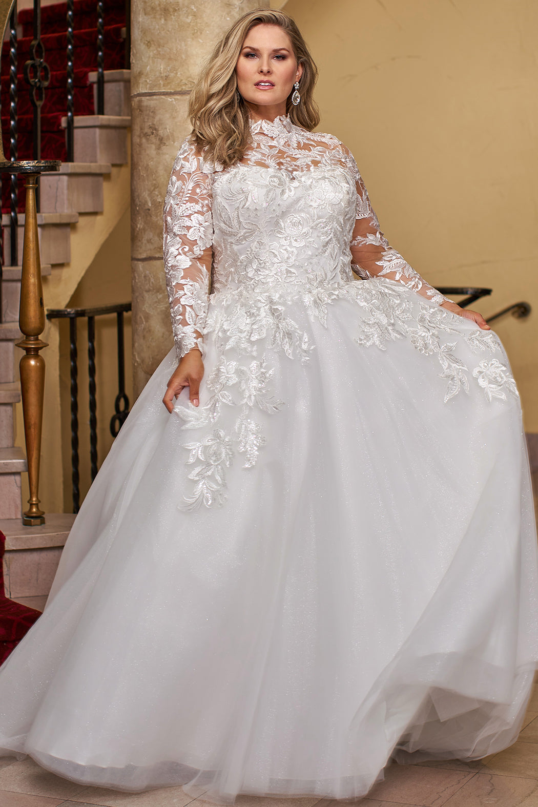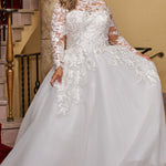 Look like a Princess on your special day in Parker, our romantic plus-size ball gown wedding dress. Delicate lace adorns the high neckline, fitted bodice, and long sleeves for a dreamy style that has you looking regal when you go down the aisle. Clear sequins, bugle beds and cut glass hand sewn on the embroidered floral lace appliques adds just the right amount of sparkle. A high neckline adds elegance to the sophisticated bodice with a sweetheart style line under the lace illusion. You'll love the long sleeves embellished with the same lace as the dress. Five buttons at the hem of the sleeve add a delicate design detail that's oh-so charming and hints of a vintage vibe. The full ball gown, with a long train, makes a dramatic and timeless fashion statement. Michelle Bridal Style MB2424 offered in two fabulous color choices: Ivory lace on Ivory mesh net or for a more modern look, Ivory Mesh on Nude Mesh Net. Created for curvy brides who wear plus sizes 14-32.