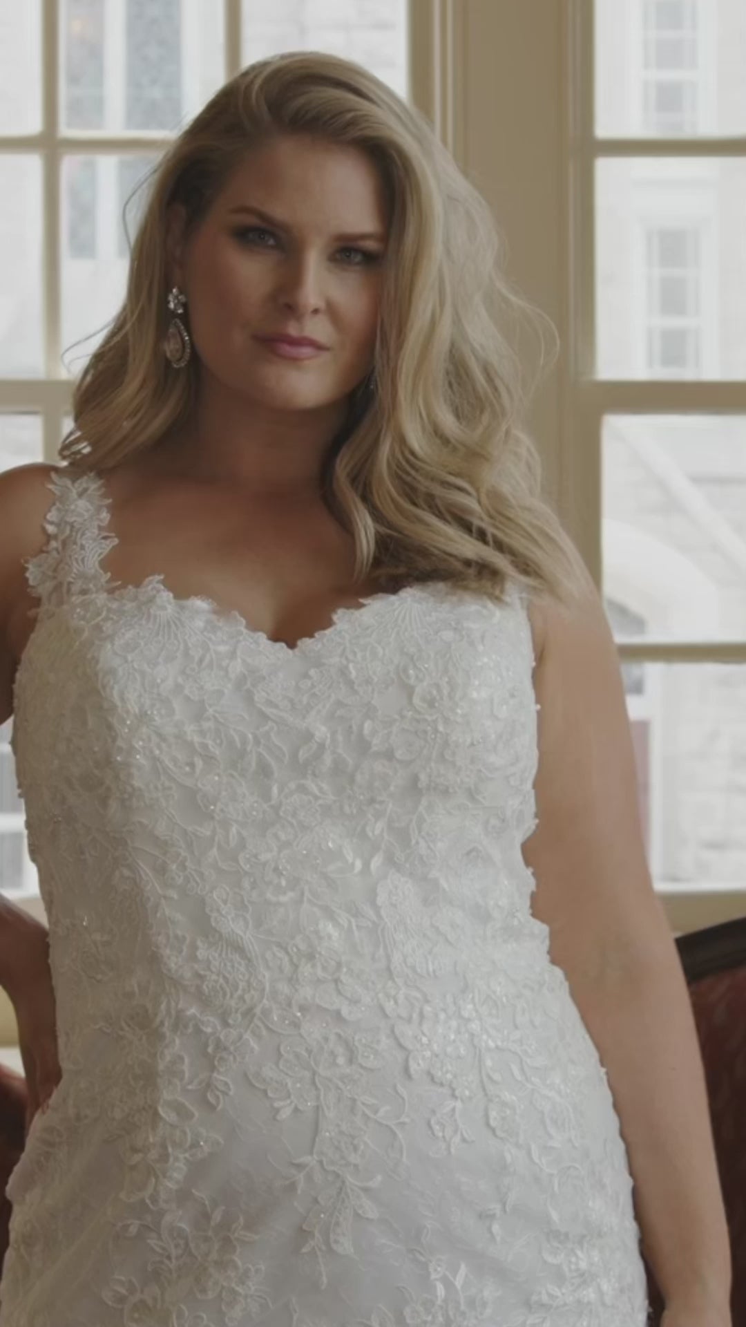 Experience true romance when you tie the knot wearing Jada, our plus size Mermaid lace wedding gown. The fitted silhouette contours your curves from the strapless sweetheart neckline to the knee then flares at the hem. Exquisite embroidered lace appliques over all the tight-fitting style and long train make this an enchanting bridal gown. A chic scoop illusion back adds a little something extra when you go down the aisle. Keep the back unlined for a sheer look or add the optional lining included with every gown. Michelle Bridal Style MB2428 available in Ivory for curvy brides who wear plus sizes 14 to 28.