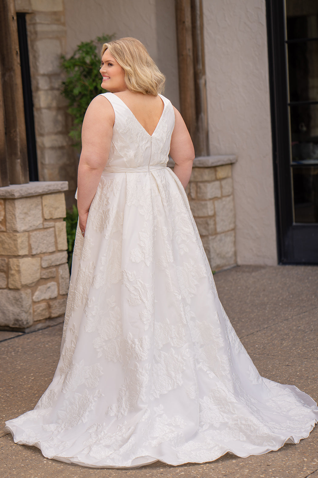 A: The classic appeal of the Acadia plus-size wedding dress comes from the timeless A-line style, the luxurious Jacquard woven fabric and the elevated detail of a statement bow.