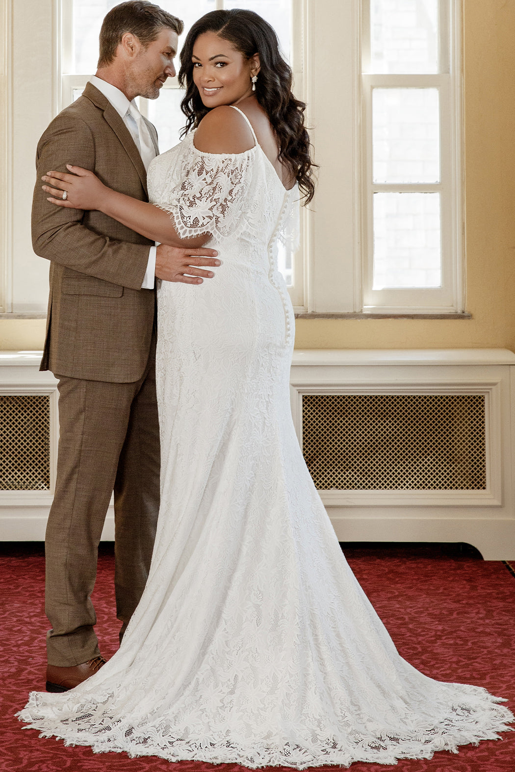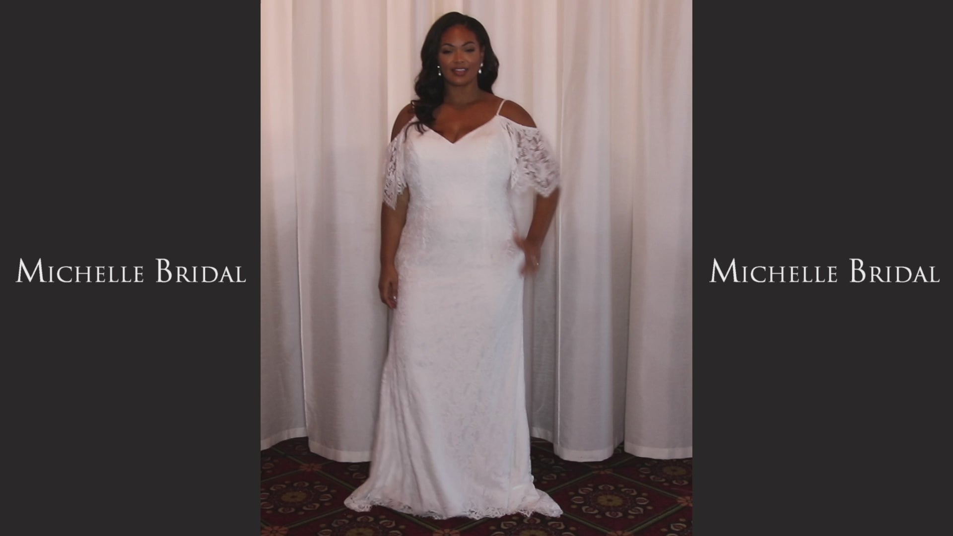 Be the curvy bride who falls head over heels in love with the vintage vibes of Kahlo lace bridal gown from the 2025 Michelle Bridal Collection. This fit and flare design centers on the helplessly romantic Boho lace over all the dress. Drape sleeves in matching lace. Covered buttons down the center back add a whimsical design detail. Scallop eyelash edge on the hem and chapel train add to the look. Stretch knit lining guarantees a flattering and oh-so comfortable fit. Style MB2306 available in plus sizes 14-32.