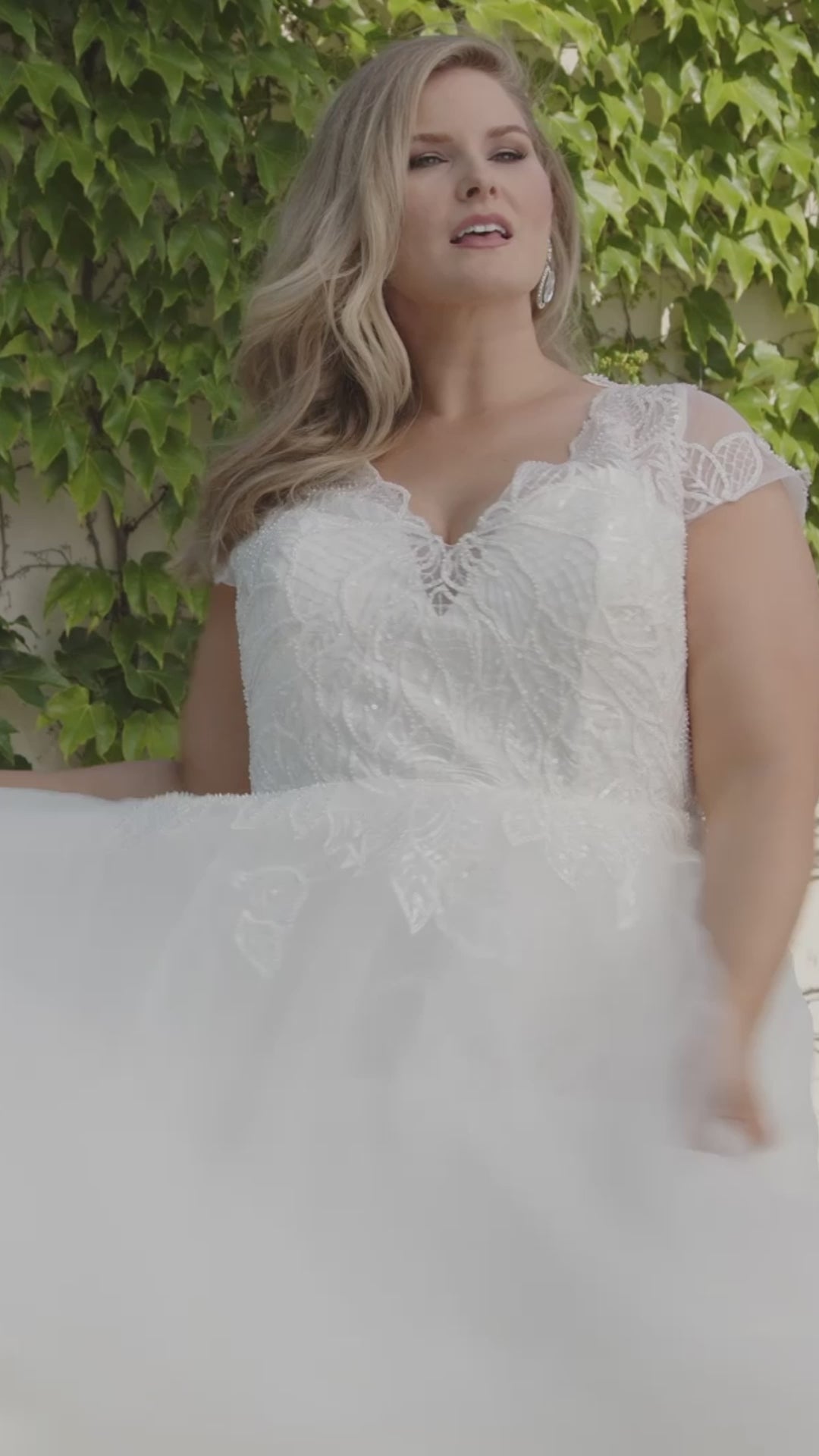 Be the curvy bride who has a choice to look elegant in Ivory or chic in Black when you go down the aisle. Classic bridal style features a lace bodice with flattering V-neckline, cap sleeves and full soft tulle A-line wedding dress with a dramatic train. Michelle Bridal style MB2309 available in plus sizes 14-40.