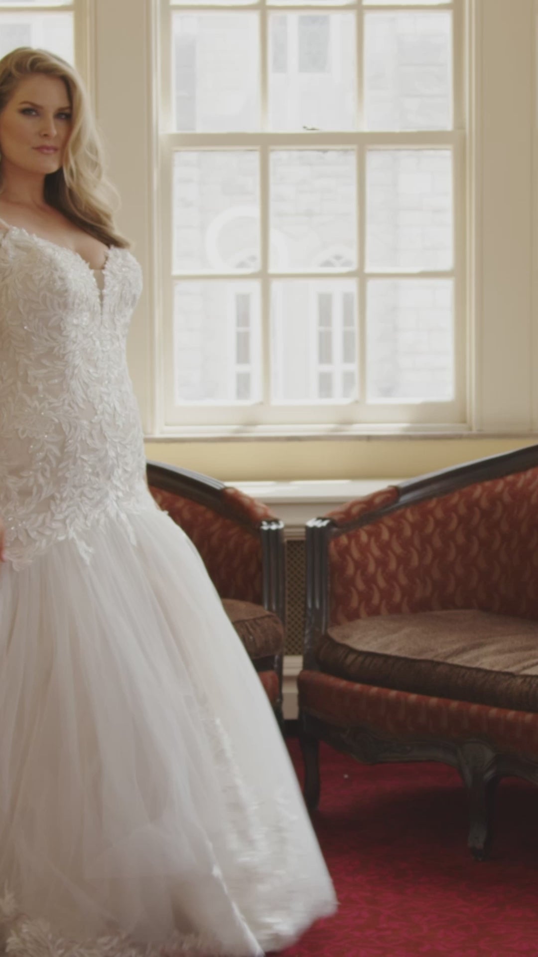 Wear our Imogene Mermaid Wedding Gown to be the picture of elegance - in person and in photos - on your big day. The romantic design features exquisite beaded lace on a fitted style and flair skirt. The same lace repeats on the detachable drape sleeves. Beaded spaghetti straps add a pretty sparkle to the boned bodice that features a lining constructed with a cincher belt to effortlessly shape your curves. Crinoline in the skirt shapes the Mermaid skirt into the look that you've dreamed of finding. A long train, hemmed in lace, looks pretty as you go up and down the aisle. Michelle Bridal Style MB2416 designed to fit and flatter curvy brides who wear plus sizes 14-32.