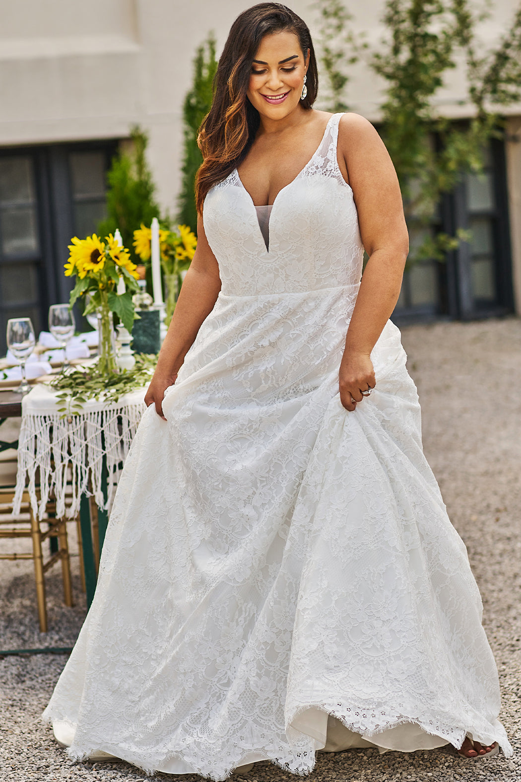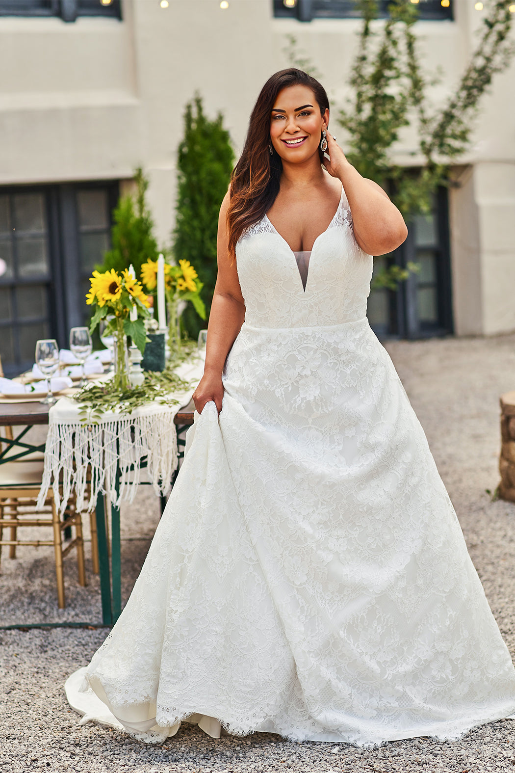 Our new Elowyn plus size Wedding Dress designed for stylish brides like you who want to make a simple, but stunning, statement when they tie the knot. An overall exquisite eyelet floral lace with delicate eyelash creates a romantic look for your wedding day. The deep V-neckline, with mesh insert, looks classy on a fitted, boned bodice with bra-friendly straps. Your choice whether to leave the lace back unlined. Or insert the optional lining that comes with every gown. The classic A-line silhouette flatters curvy brides of all sizes and shapes. Effortlessly elegant in Ivory for formal or informal ceremonies. Michelle Bridal Style MB2417 comes in a wide range of curvy plus sizes to fit brides sizes 14 through 32.