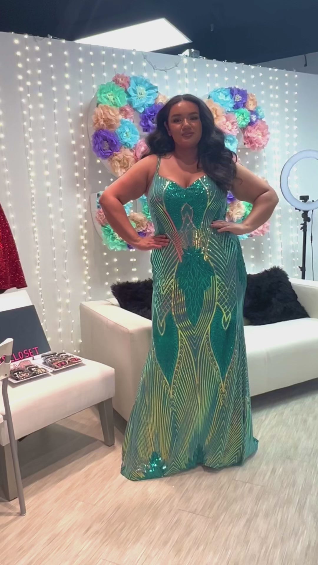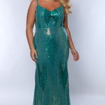 You will be the fashionista who stands out at Prom 2025 or any fancy formal event when you this trendy fitted plus size Mermaid dress. Eye-catching sequins on stretch mesh net sparkle in a shiny Art Deco pattern that creates a slimming vertical line, Sweep train on slim, fitted skirt adds to the elegant look. The bra-friendly straps, in matching sequins, mean you don't have to wear a fussy strapless. Blue, Emerald, Magenta. See unique sparkly long gown now. A stretch lining gives you all the freedom to look glamorous and be comfortable on your big night. Tease Prom styles TE2402 designed for curvy women in plus sizes 14 to 24. Stunning in your choice of Emerald Green, Magenta Pink or Royal Blue.