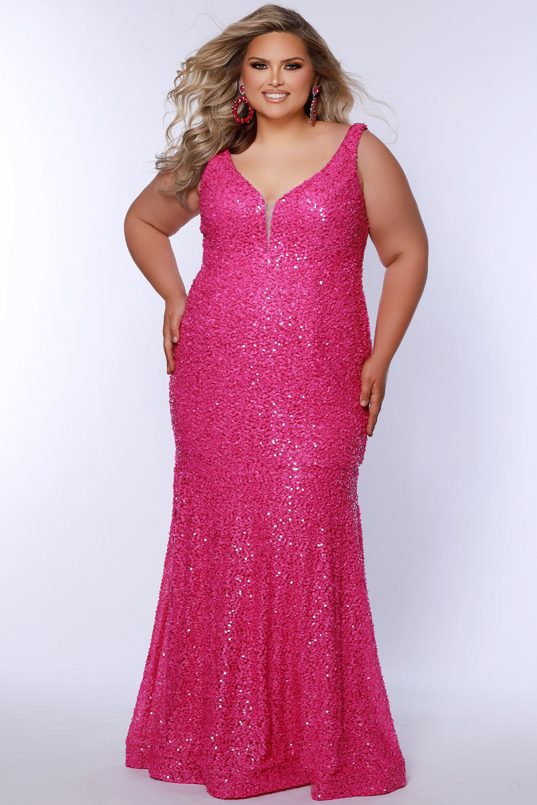 Flaunt your curves in TE2519! With a deep V-neckline and trumpet silhouette, this dress will highlight your best features. Available in Raspberry pink and Tangelo orange, its stretch sequins, mesh, and knit lining provide comfort and style. Perfect for prom or your next night out.