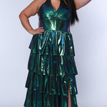 Own the night in this iridescent Plus Size Halter Gown. With its oil-slick finish shimmering in shades of peacock and prism, this dress is not for the faint of heart. The halter neckline and exposed corset boning create a look that's both edgy and glamorous, while the tiered A-line skirt flows with every move. Whether you're hitting the dance floor or owning the spotlight, this gown is ready to make a statement.