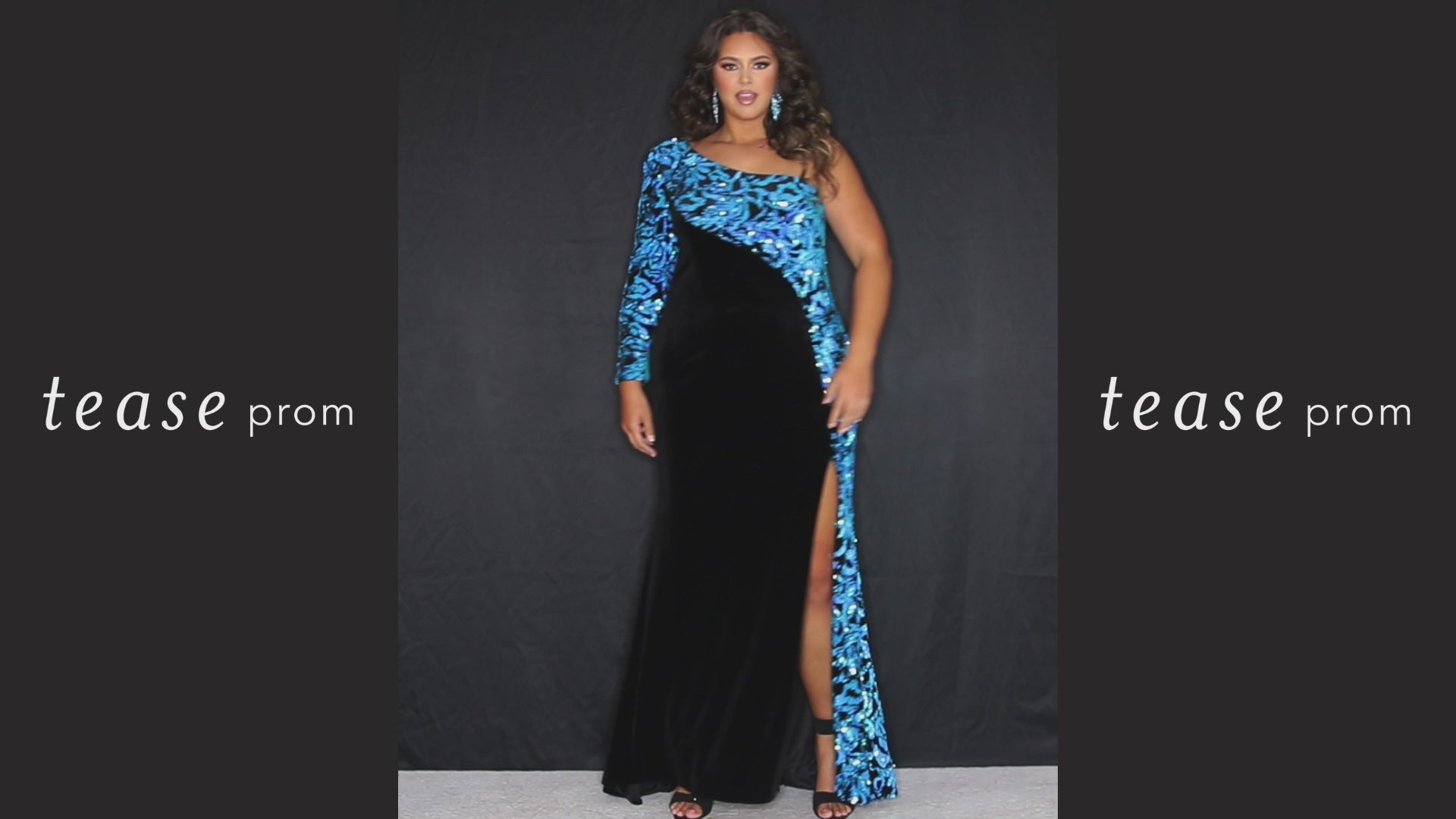 Just own it! The mix of sequin and velvet makes for a stunning fashion moment. One-shoulder bodice with a long sleeve covered in reversible flip sequins continues down the dress creating beautiful lines across your curves. The light stretch velvet on this one shoulder gown keeps you comfy while specially placed boning hugs your figure in the most perfect way. Sexy side slit just adds to the wow of this show stopping dress.