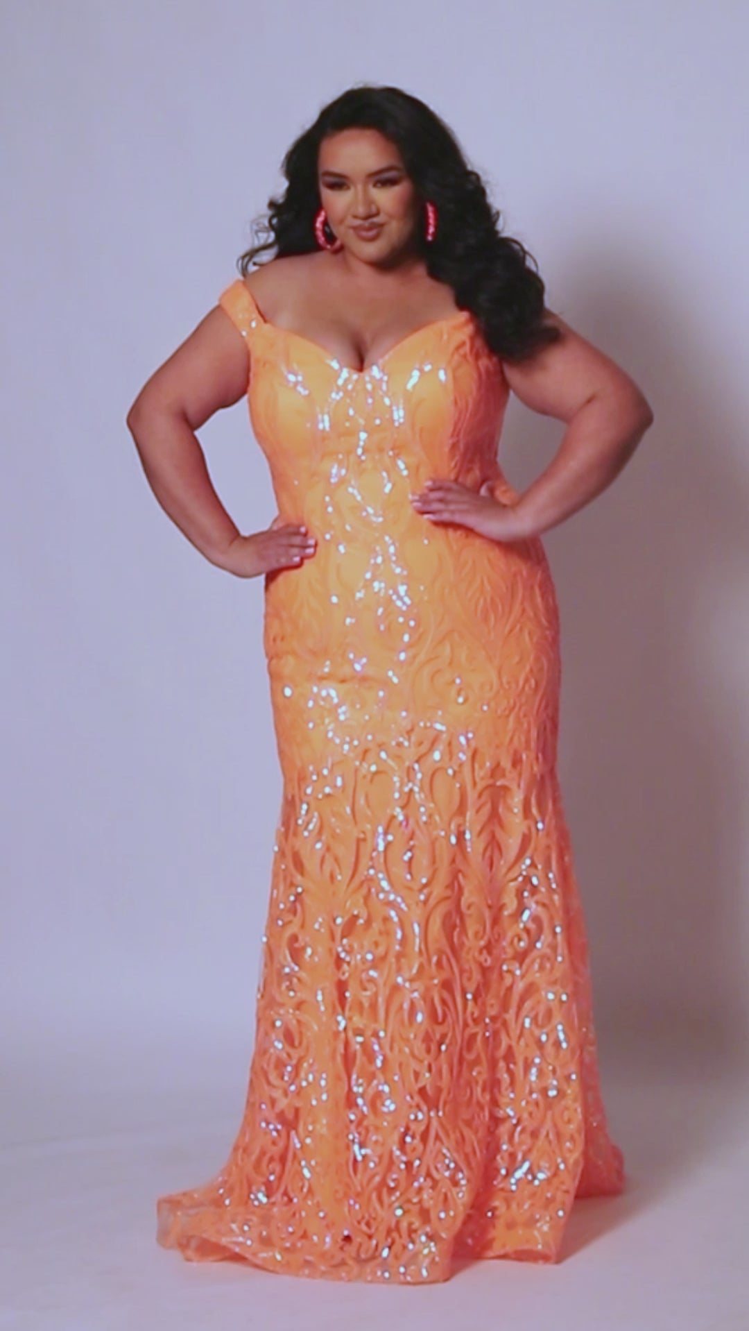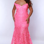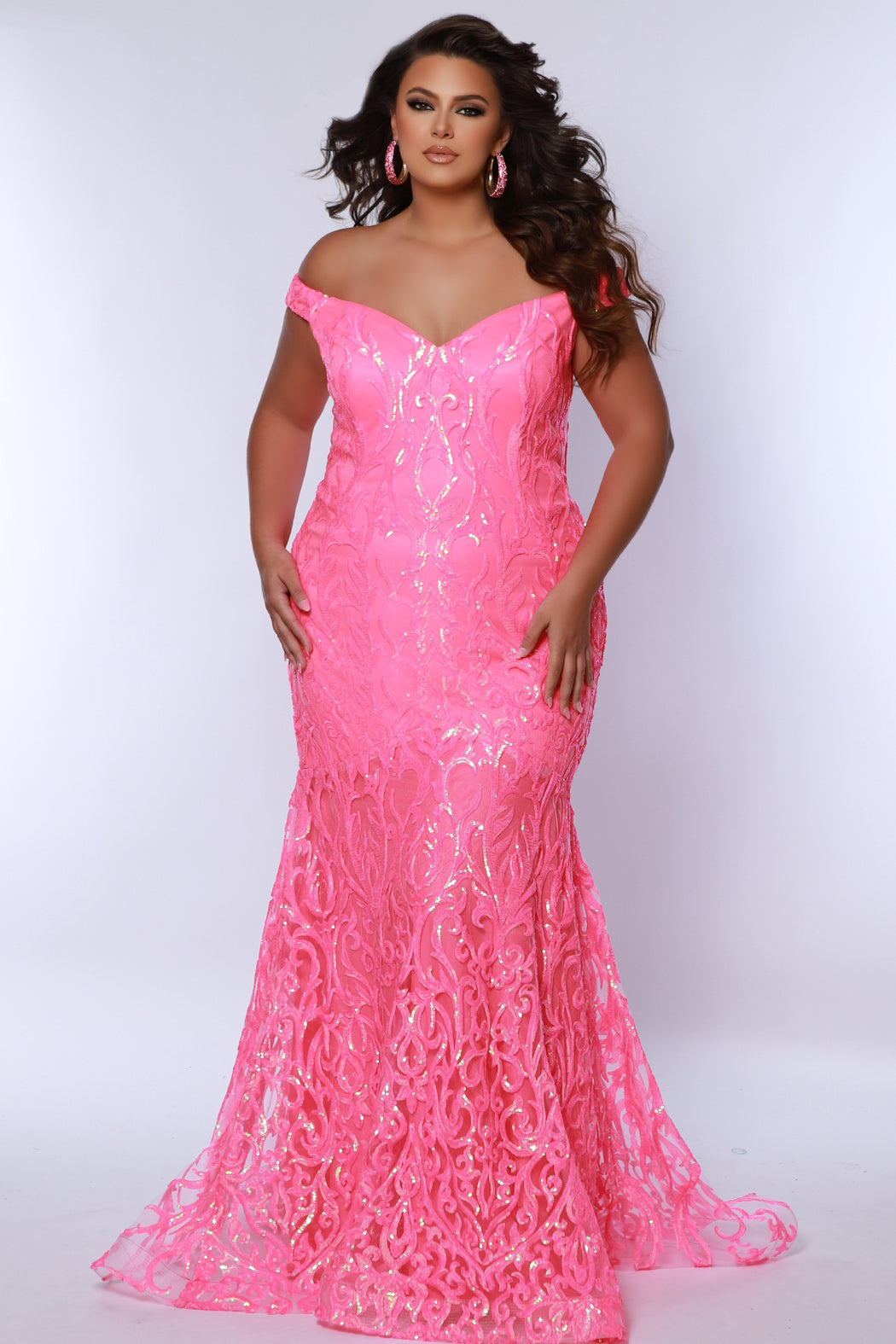 Look hot at Prom 2025 or any formal occasion when you enter wearing this sexy sequin embroidered evening gown in sparkling hot pink or eye-popping tangelo orange. Fitted off-the shoulder style hugs your curvy figure in all the right places. Train adds a red-carpet touch to your glamorous evening look. Tease Prom styles TE2411 created exclusively in curvy sizes 14 to 28 for fashion-savvy teens and women.