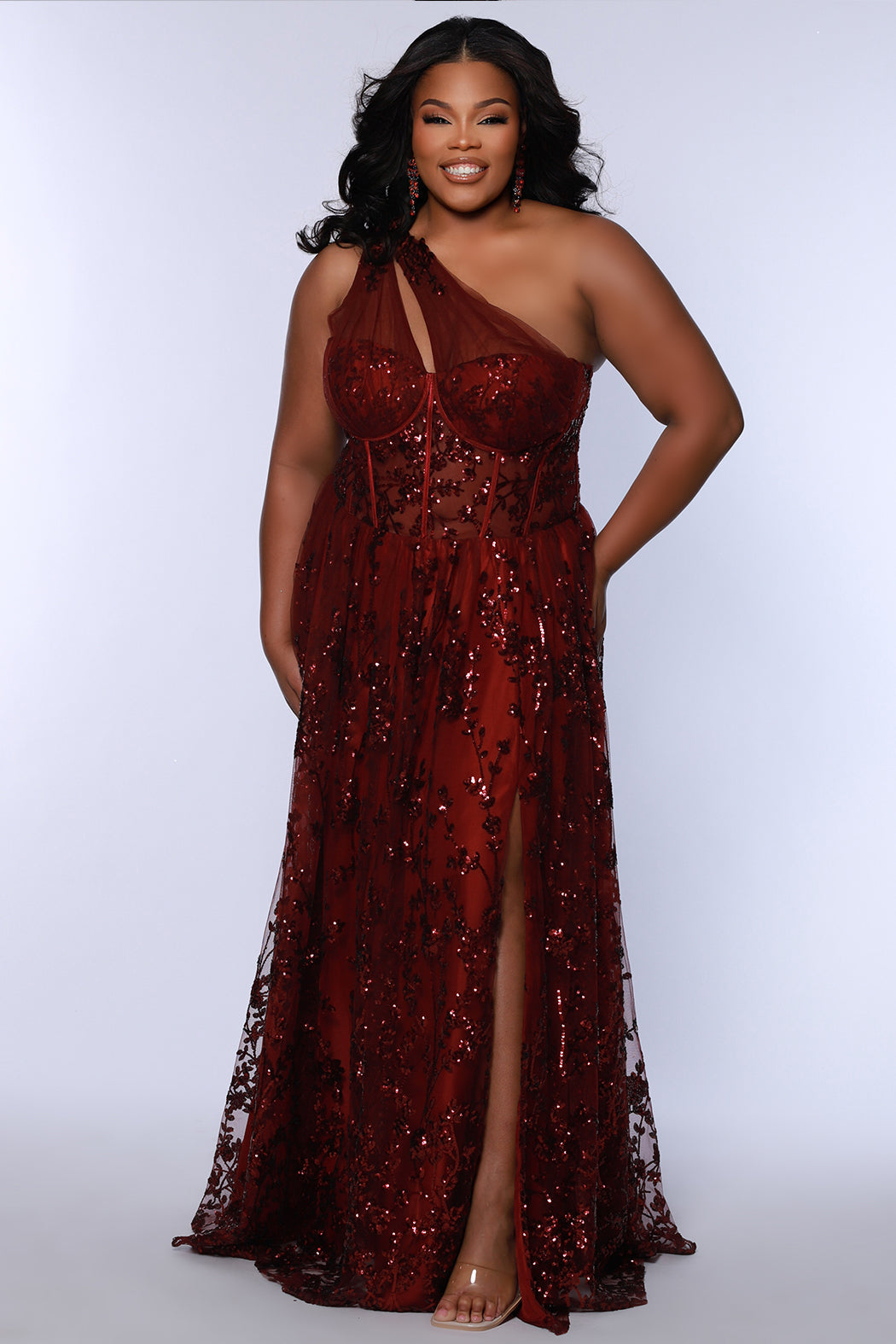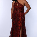Plus size prom ball gown with glitter lace and tulle. Style TE2529 by Tease Prom is avialable in burgundy red, forest green or onyx black in sizes 14-32.  One shoulder with illusion cut out on sweetheart bodice with exposerd corset boning.