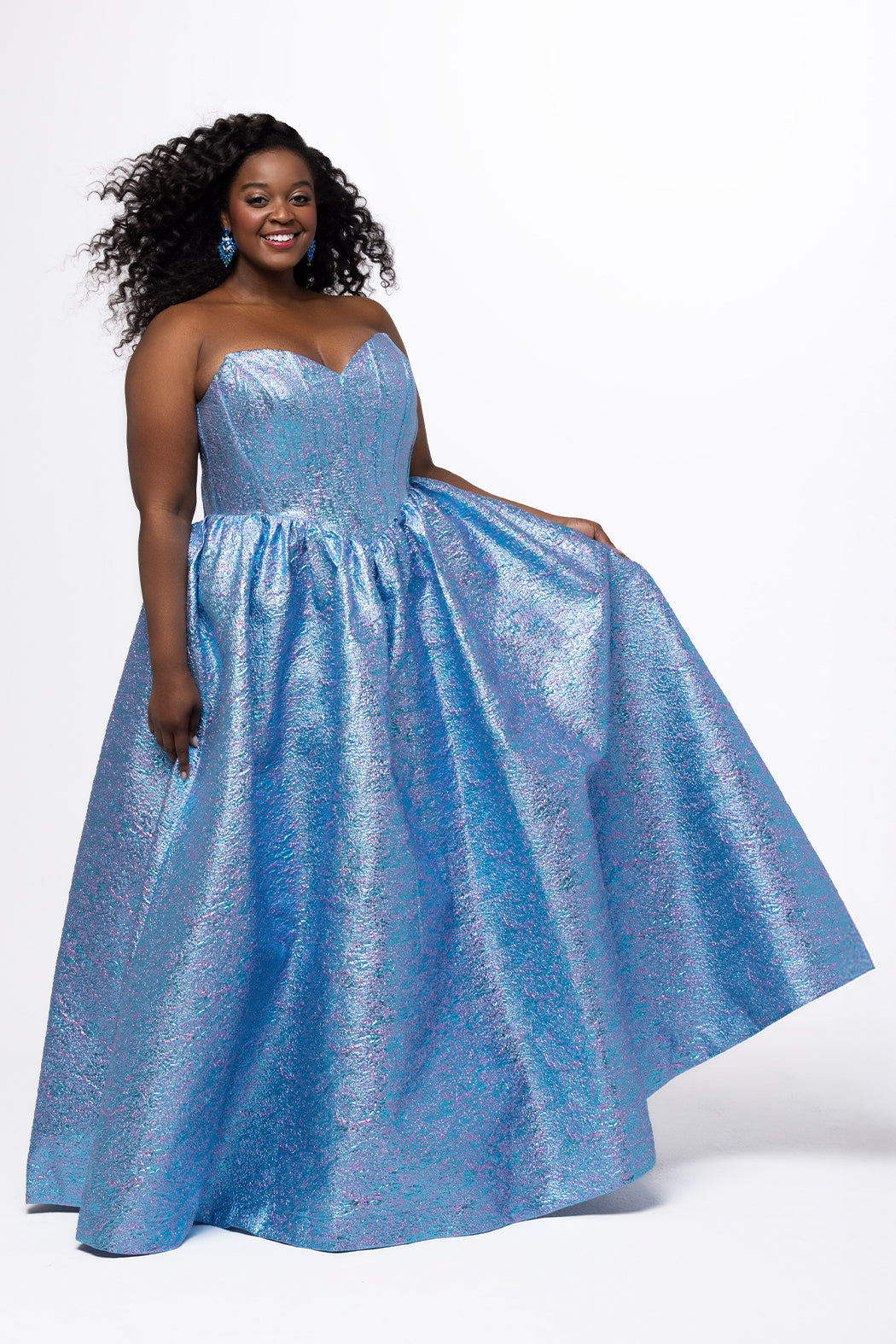 Twirl into your happily ever after with the Plus Size Ball Gown. This dreamy dress, in a captivating shade of blue, features shimmering metallic brocade fabric that catches the light with every move. And guess what? It has pockets! The modified sweetheart neckline and tiered ball gown skirt flatter your figure, while the exposed corset boning adds a touch of support. With its full skirt and horsehair hem, this gown is ready for a magical night of dancing and unforgettable moments.