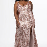 Slim fitted plus size gown. Sequin detail over stretch knit lining. V-neckline with double spaghetti straps. Left leg slit and center back zipper. Available in sizes 14-24 in Wine and rose gold.