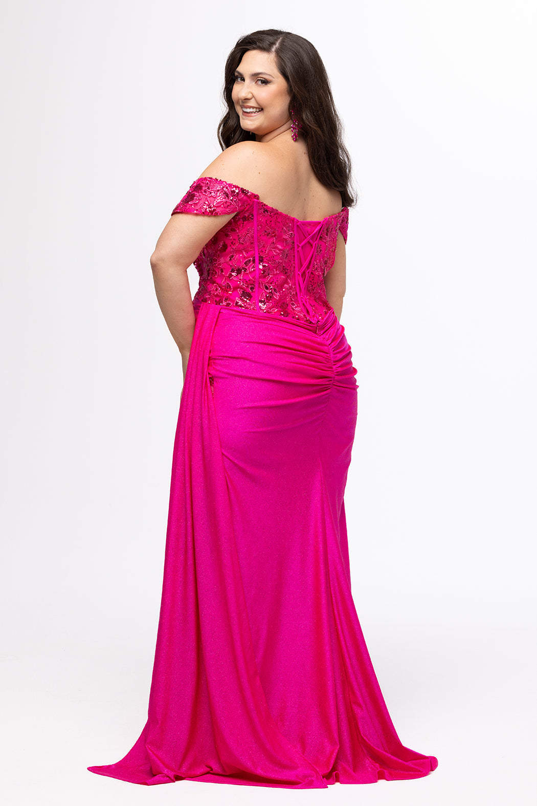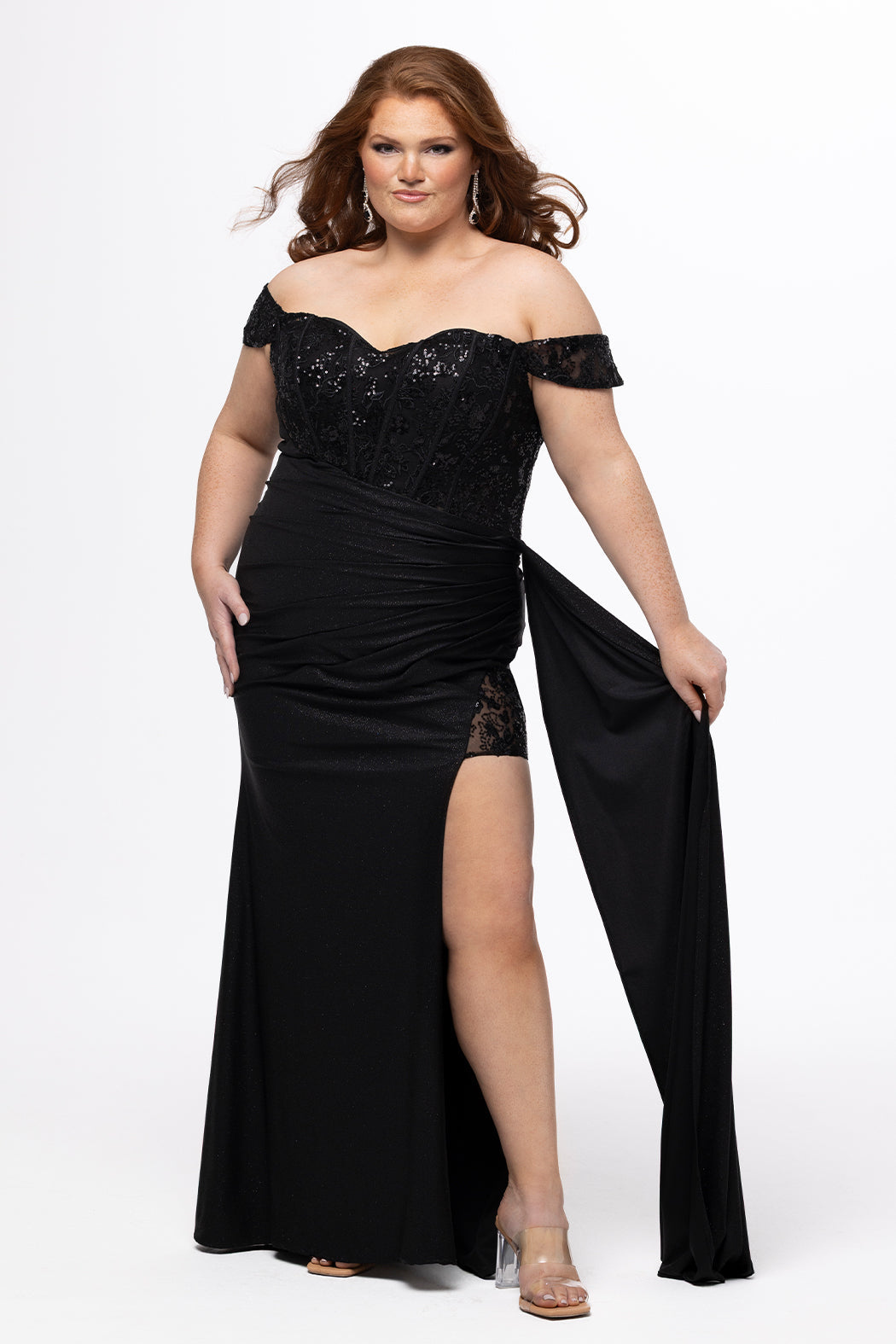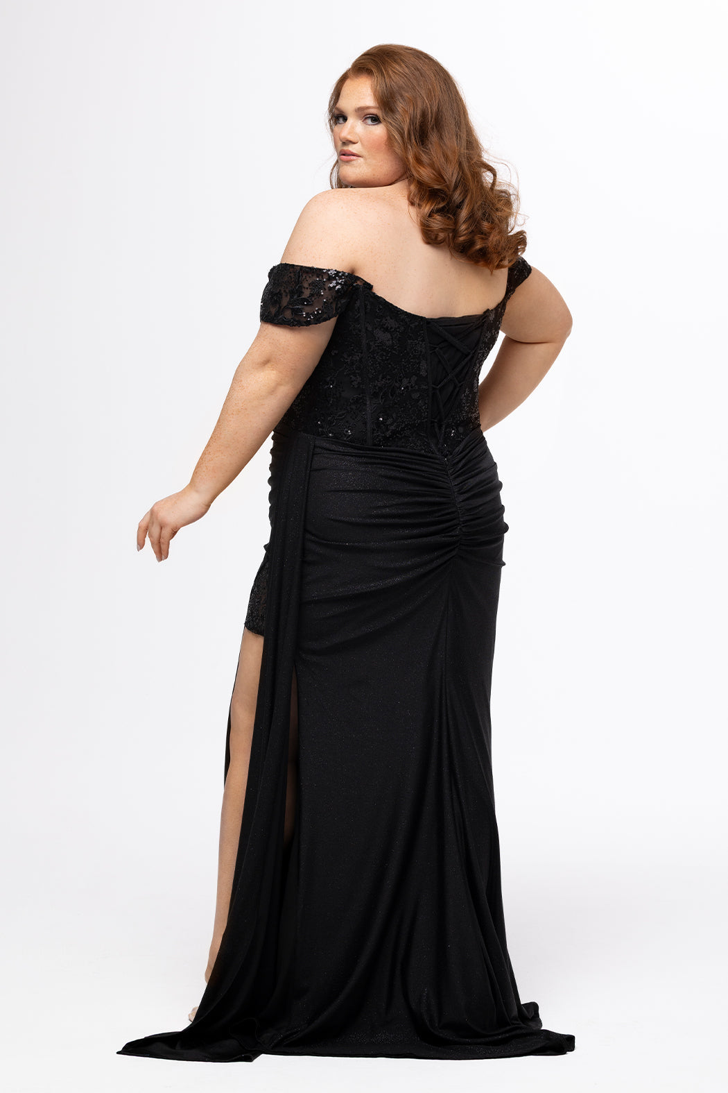 Slay Prom night 2026 when you wear this glamourous fitted long formal dress designed by Tease Prom. Crafted from stretch sparkle jersey that hugs your curves, this gown features a sweetheart neckline with draped pleating and exposed corset boning for that sculpted hourglass look. The ruched skirt and high slit are accented with delicate appliqués on sheer net, while the draped flyaway detail adds red-carpet energy. Finished with a lace-up back for a flawless fit, this gown is an iconic choice for prom night! Tease Prom Style TE2629 is available in Onyx Black, Hot Pink, Sapphire Blue, and Cherry Red for curvy teens who wear sizes 14 to 24.