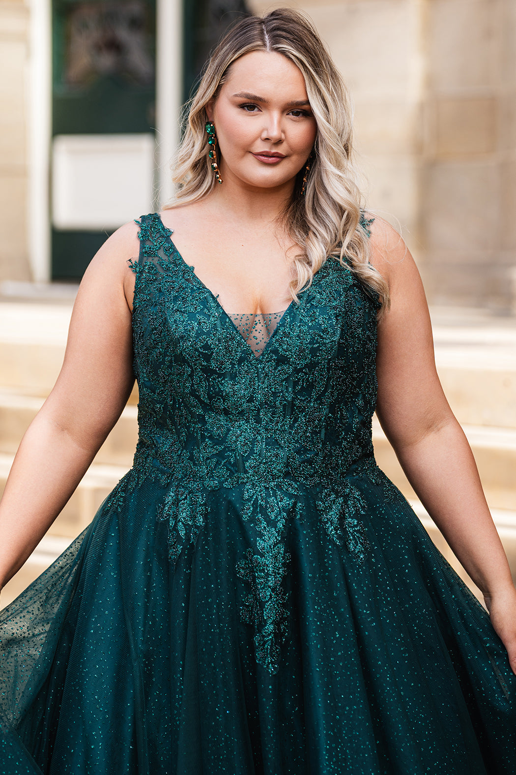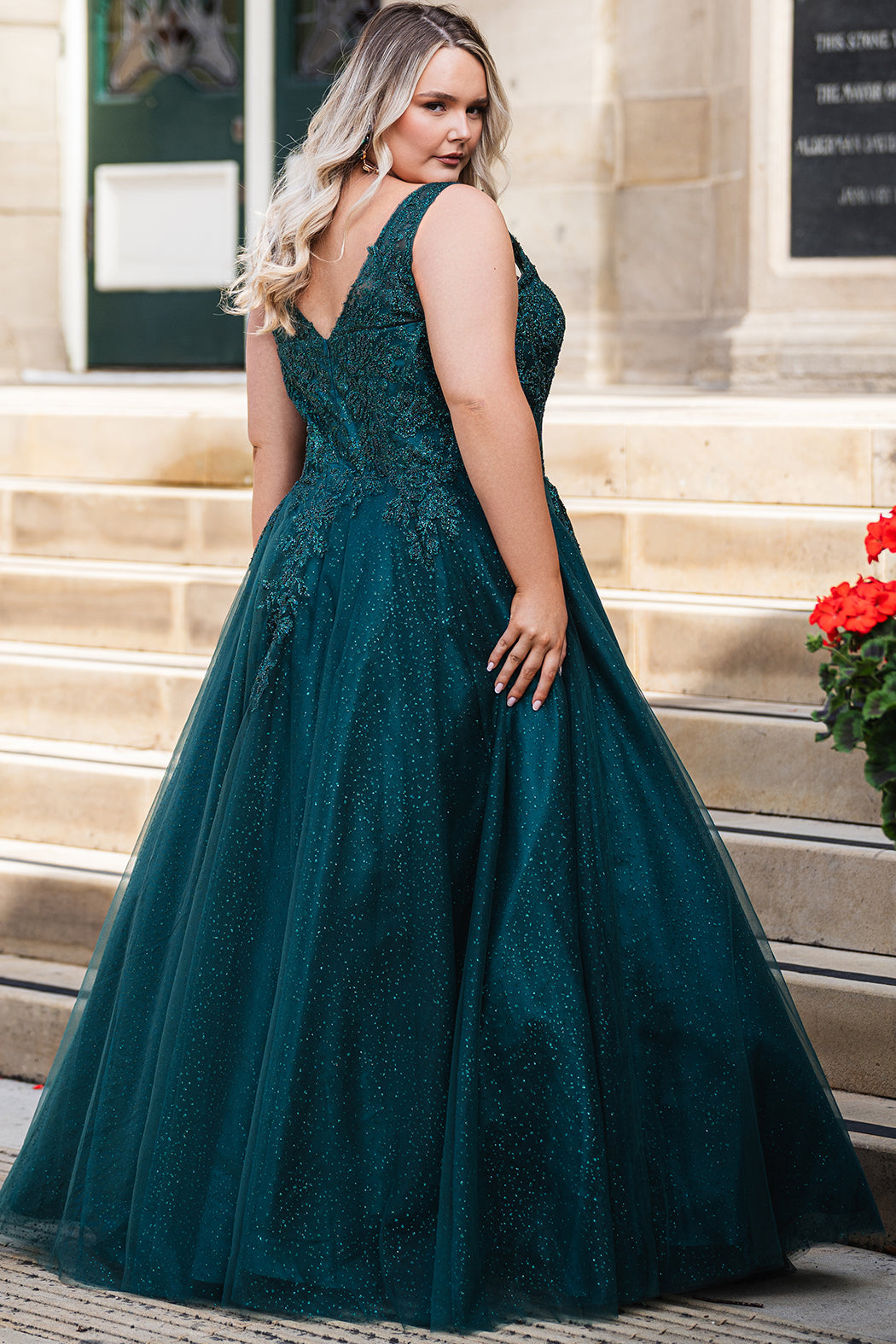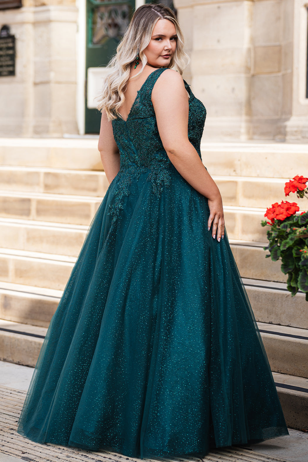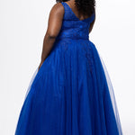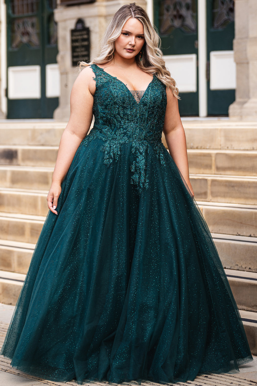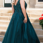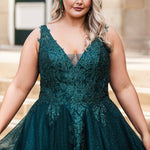 A-line sparkle tulle plus size ballgown. Beaded & glitter appliques, V-neckline, Illusion straps, Tone-on-tone mesh insert, Natural waistline, Pockets. Available in Burgundy, forest and blue and black in sizes 14-32.