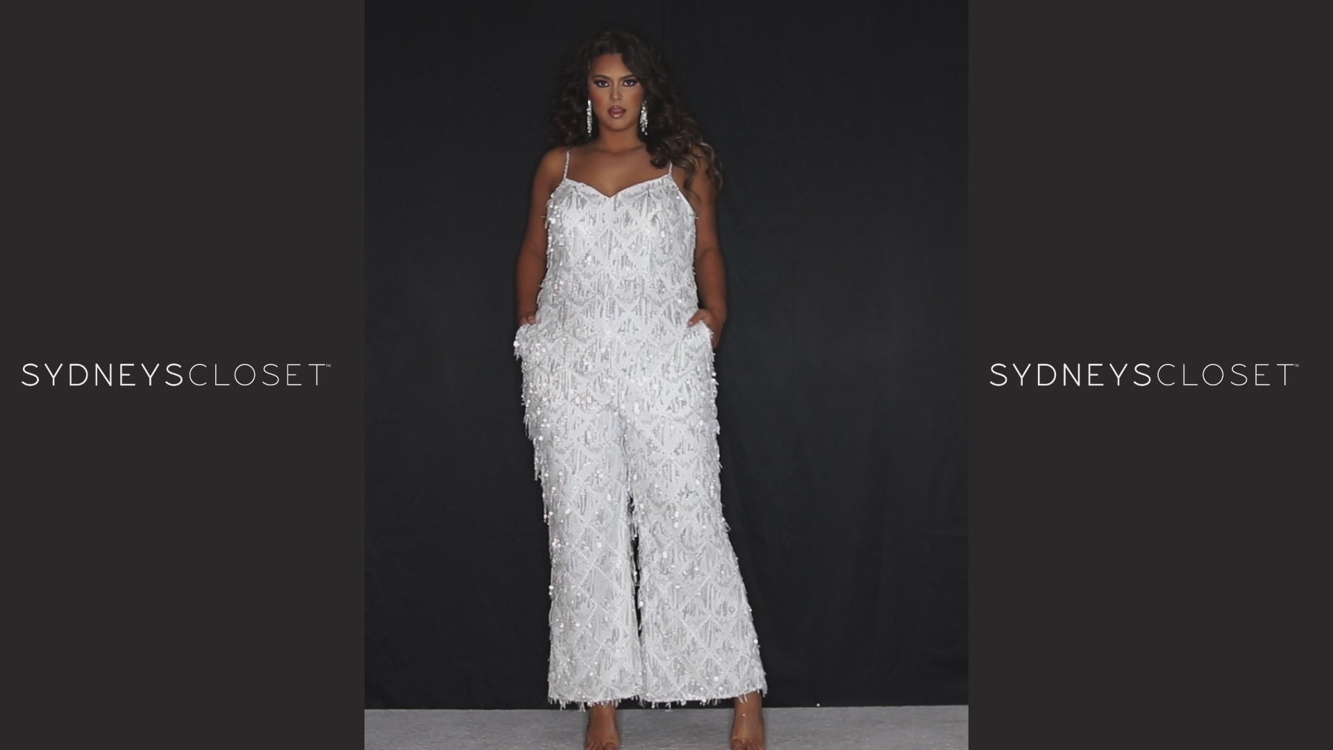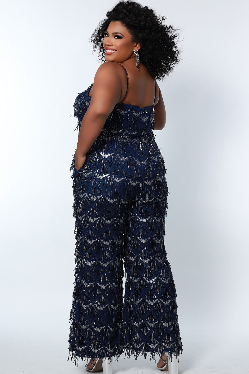 Twist and shout, because fun is what this jumpsuit is all about! Shining in shades Diamond White, Navy Blue, and Sangria Red, the sequin fringe fabric is placed to perfection along the spaghetti straps, v-neckline, and wide leg pants with pockets. This powerhouse plus size jumpsuit is a fabulous opportunity to trade in a traditional dress for a modern, eye-catching twist!