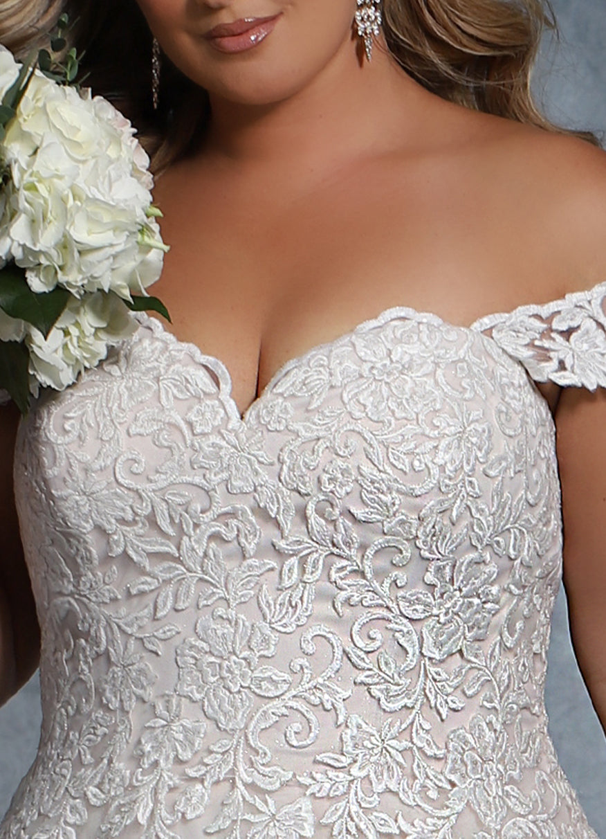 Full busted: Shop for off-the-shoulder portrait or v-neckline. Keep bodice simple with as few details as possible. Stay away from a high neck and low necklines heavy beading. Stick with a sweetheart or V neckline or off the shoulder.