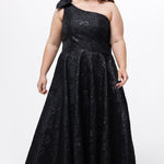 Turn every entrance into a grand moment with Midnight Blooms, our plus-size black brocade maxi dress that defines modern elegance with a hint of drama. The textured floral brocade shimmers subtly under the light, adding richness and depth to your look without feeling overdone. Designed for curvy women who love fashion with an edge, the asymmetric neckline and detachable statement bow on the one-shoulder make this curvy evening gown unforgettable. A structured bodice smooths and sculpts, while the full A-line skirt with pockets moves beautifully with every step. Perfect for black-tie weddings, holiday galas, or any evening that calls for elevated glamour, Midnight Blooms proves that timeless doesn’t have to mean traditional. Sydney’s Closet Style CE2614 shown here in Black; also available in Black with Pink Rose metallic flowers..