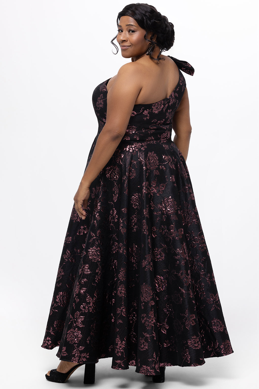 A: Midnight Blooms makes the perfect fashion choice for winter weddings, black-tie galas, evening receptions, or any event where you want to feel sophisticated and feminine. The black-and-pink floral brocade makes it especially stunning for holiday celebrations or Valentine’s season.
