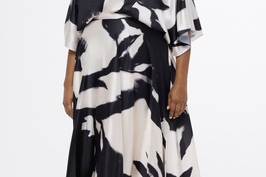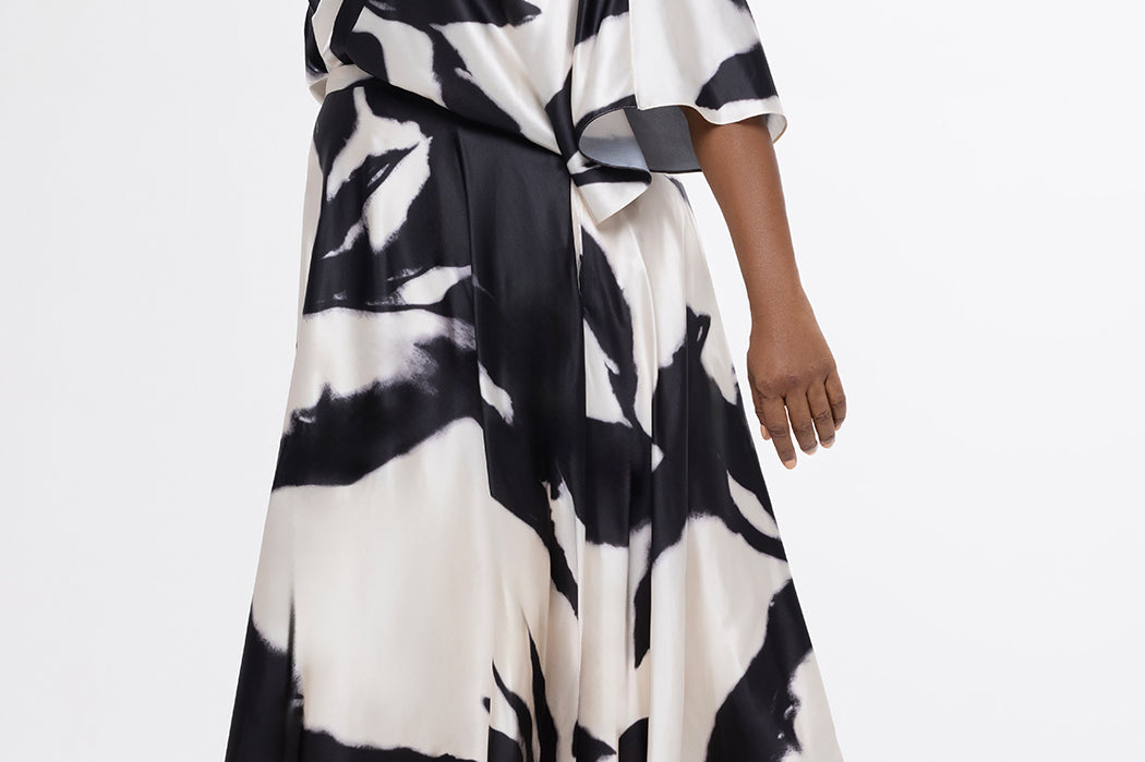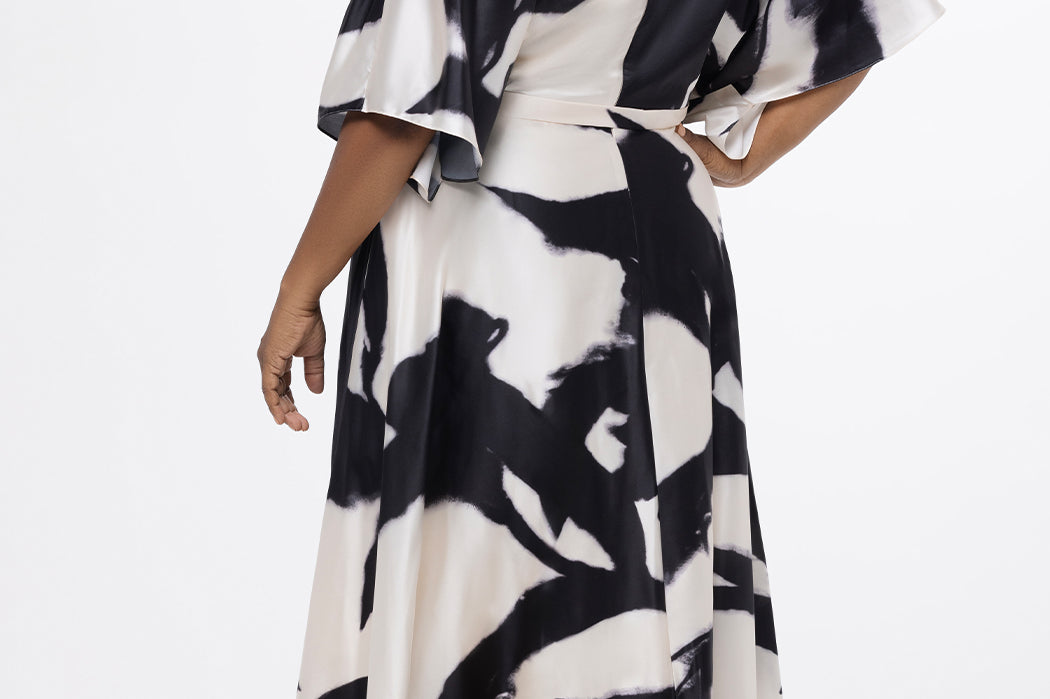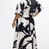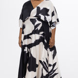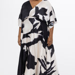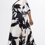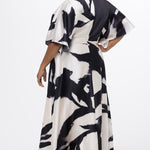 Take center stage when you wear Modern Muse, our dramatic plus-size satin print maxi dress. The bold abstract pattern of painterly black splashes on silky cream satin makes a dramatic fashion statement. The surplice V-neckline flatters the bust, while loose-fitting Dolman sleeves keep you cool and comfortable. An A-line skirt gives you playful pockets. This Summer or Spring maxi dress in plus sizes is sure to earn compliments for brunches, garden parties, poolside, or beach, destination, or informal weddings, or resort getaways. Dress it up for a fancy invite with high heels and a patent leather clutch purse. Dress it down for a casual event with platform sandals and your choice of a black or cream straw brim hat. Either look, let the compliments roll. Sydney's Closet Style CE2620 shown in Black and Cream abstract satin print.