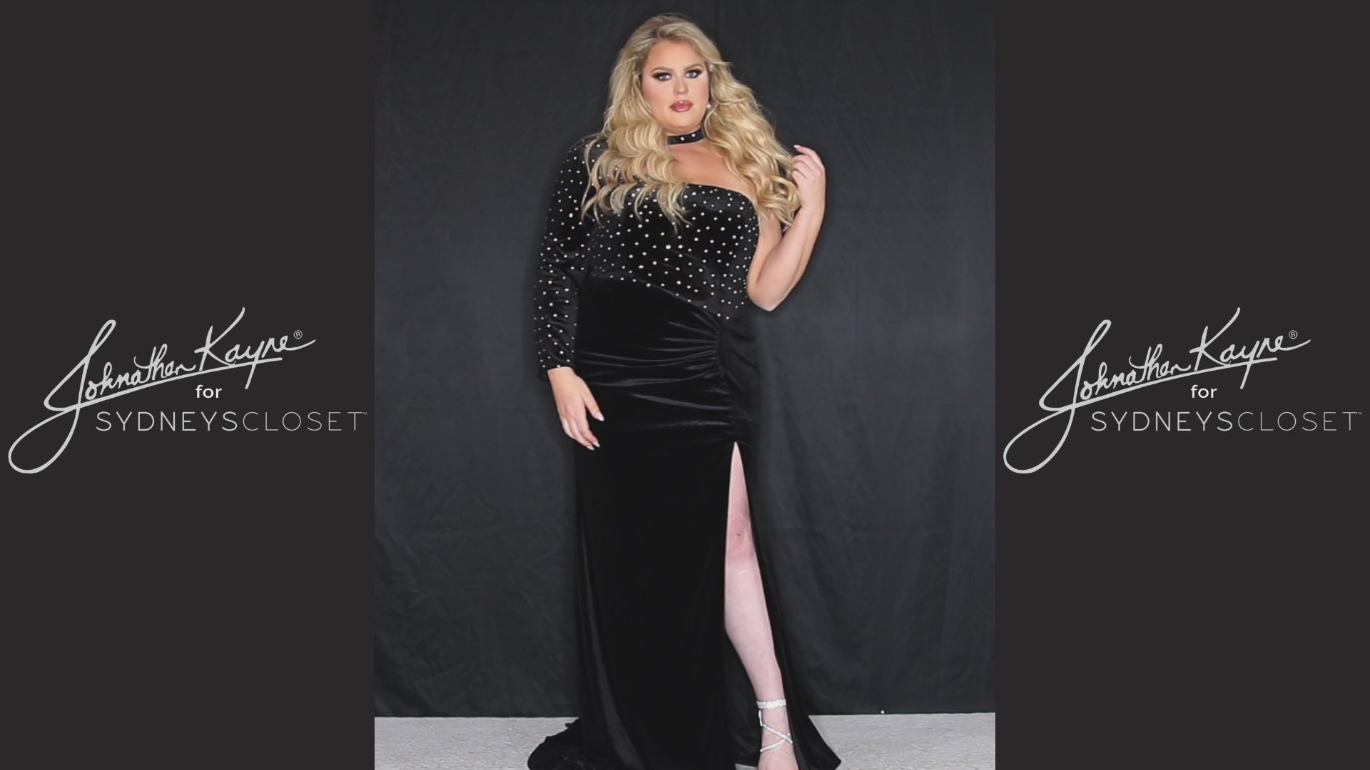 Vixen in velvet? A luscious design in stretch velvet chocker gown with hotfix stones comes in colors Crimson and Onyx, while the slim fit silhouette shows off your curves like no other. Strapless bodice with choker neckline sets itself apart with one-shoulder long sleeve detail. Asymmetrical waistline with ruching transforms your figure as it flows into a fitted skirt with slit, and finishes in a long train.