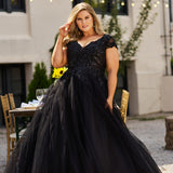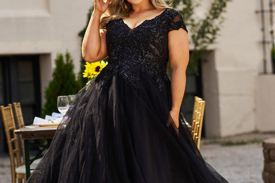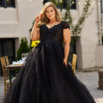 Be the curvy bride who has a choice to look elegant in Ivory or chic in Black when you go down the aisle. Classic bridal style features a lace bodice with flattering V-neckline, cap sleeves and full soft tulle A-line wedding dress with a dramatic train. Michelle Bridal style MB2309 available in plus sizes 14-40.