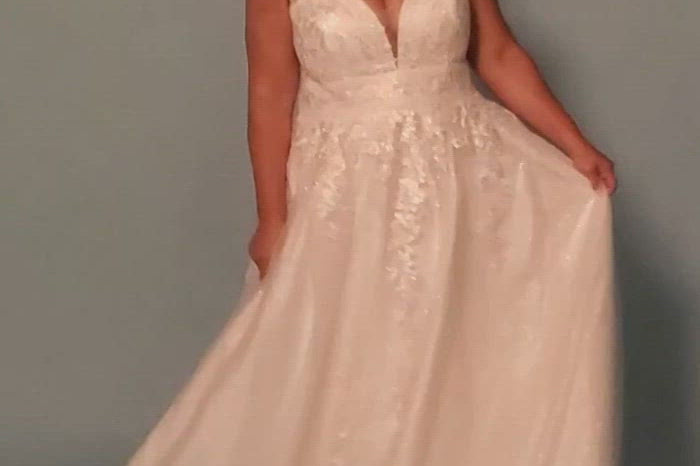 Romantic and effortlessly radiant, the Hazel wedding gown captures the magic of a modern fairytale. Crafted from layers of glitter tulle with embroidered lace appliqués, this A-line silhouette shimmers softly with every step. The deep V-neckline with a sheer mesh insert flatters the décolletage, while the natural waistline defines and enhances your curves. Finished with a flowing 63-inch train and satin lining for comfort, Hazel blends timeless elegance with light-catching sparkle for the bride who wants to glow all day long. Sydney’s Closet Style SC5255 shown in Ivory. Also available in Black for the alternative bride.