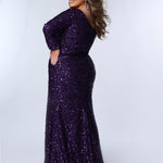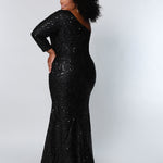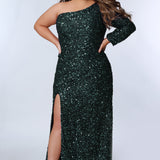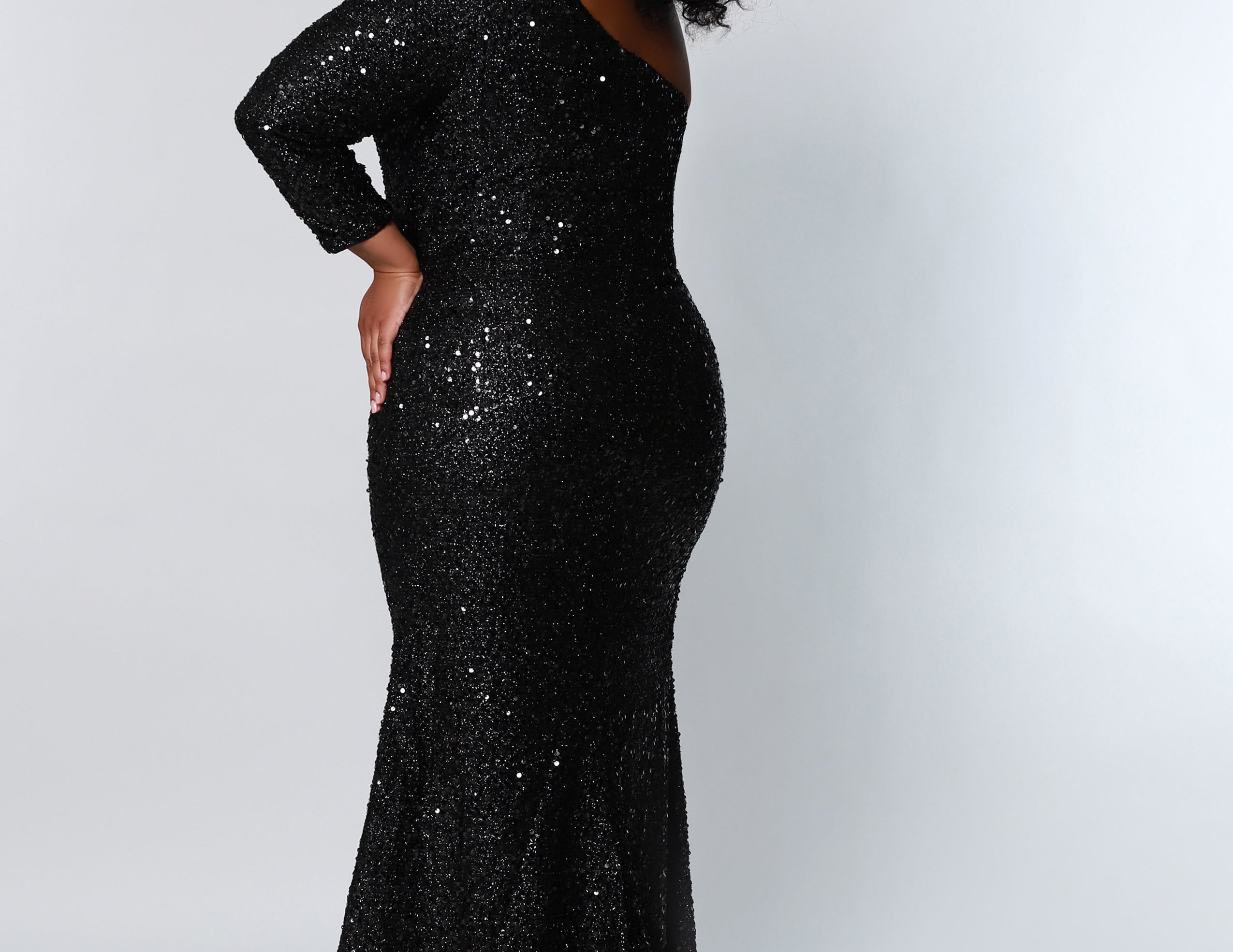 Look flawless in this versatile curve-hugging one-shoulder prom dress. The single long sleeve dress is on trend and creates flattering lines as it transitions into a scoop neckline. The stretch knit lining and net fabric, with glimmering paillettes in shades of Hunter Green, Onyx Black, Pearlescent White, Ruby Red, Purple and Sapphire Blue, will shine with every step you take. Keep the fun going with a sexy high slit and short train.