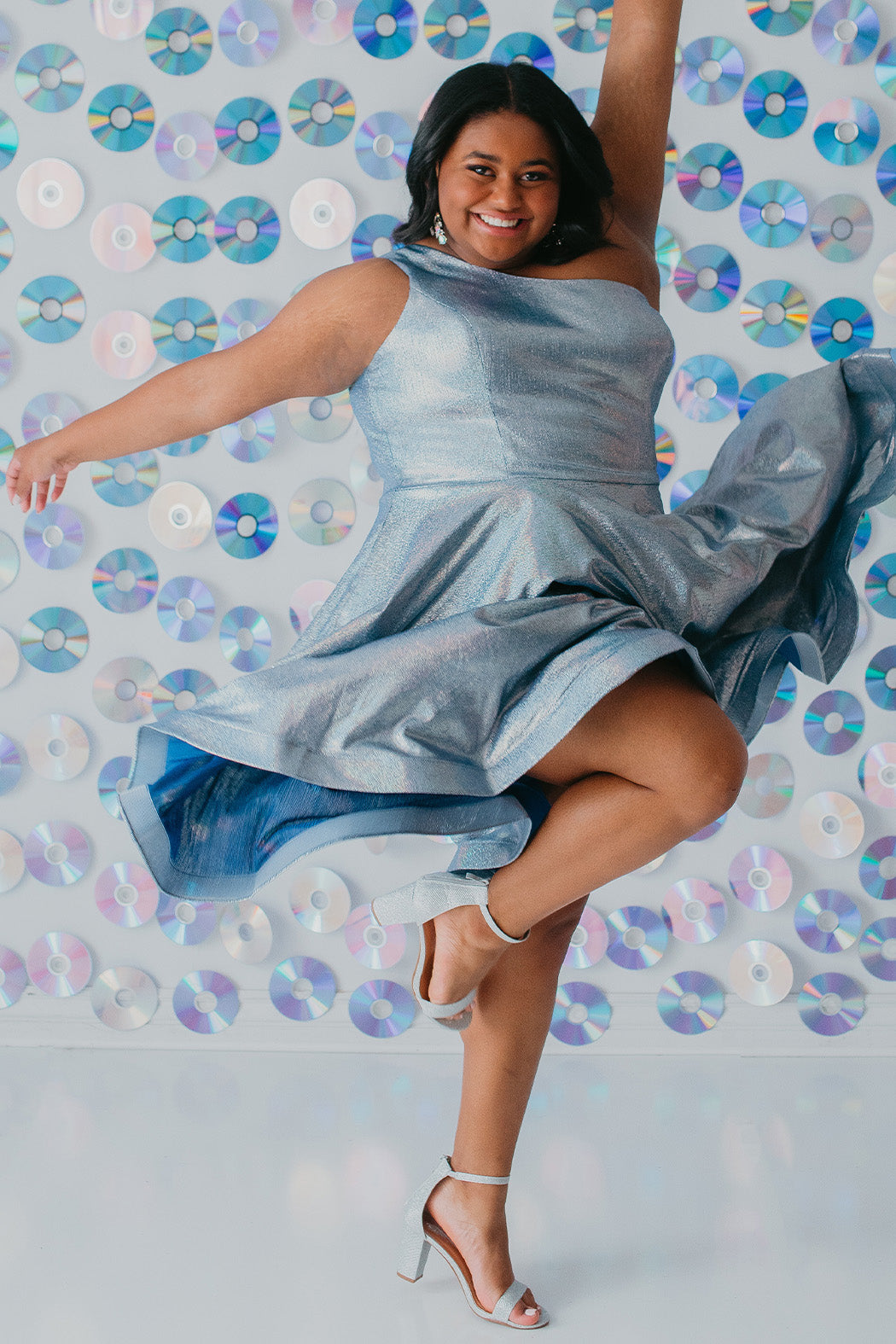 A: Pair it with simple jewelry and a clutch to let the dress shine. The metallic fabric adds enough flair, so minimal accessories are needed.